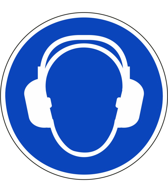 ISO-7010 'gehoorbescherming verplicht' stickers zijn verkrijgbaar in verschillende afmetingen en tevens in spiegelbeeld.
