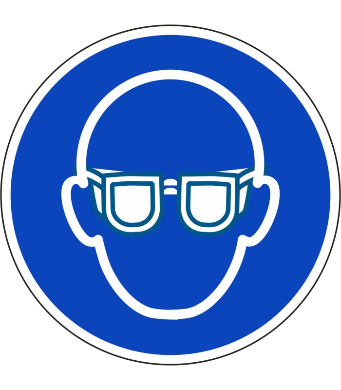 ISO-7010 'oogbescherming verplicht' stickers zijn verkrijgbaar in verschillende afmetingen en tevens in spiegelbeeld.