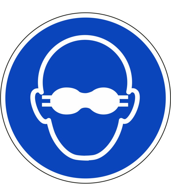 ISO-7010 'opaque bril verplicht' stickers zijn verkrijgbaar in verschillende afmetingen en tevens in spiegelbeeld.