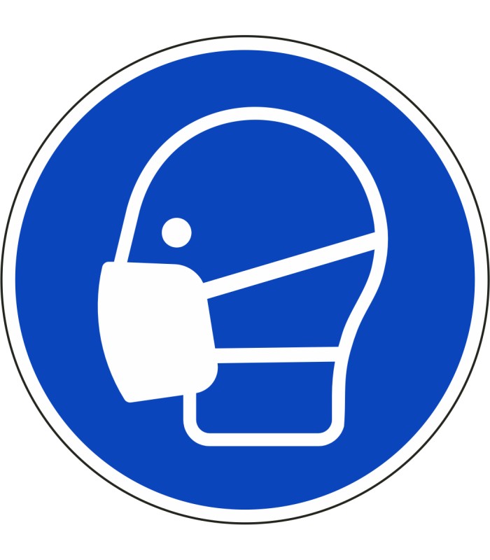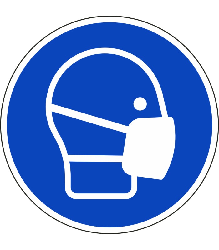 ISO-7010 'mondkapje verplicht' stickers zijn verkrijgbaar in verschillende afmetingen en tevens in spiegelbeeld.