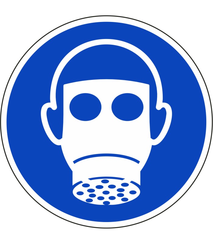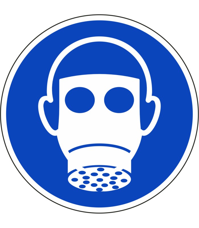 ISO-7010 'ademhalingsbescherming verplicht' stickers zijn verkrijgbaar in verschillende afmetingen en tevens in spiegelbeeld.
