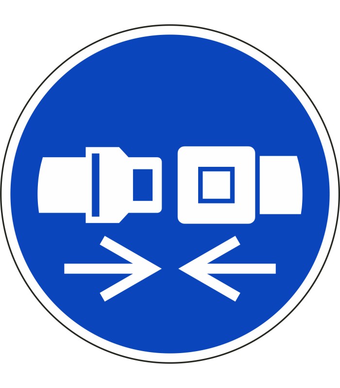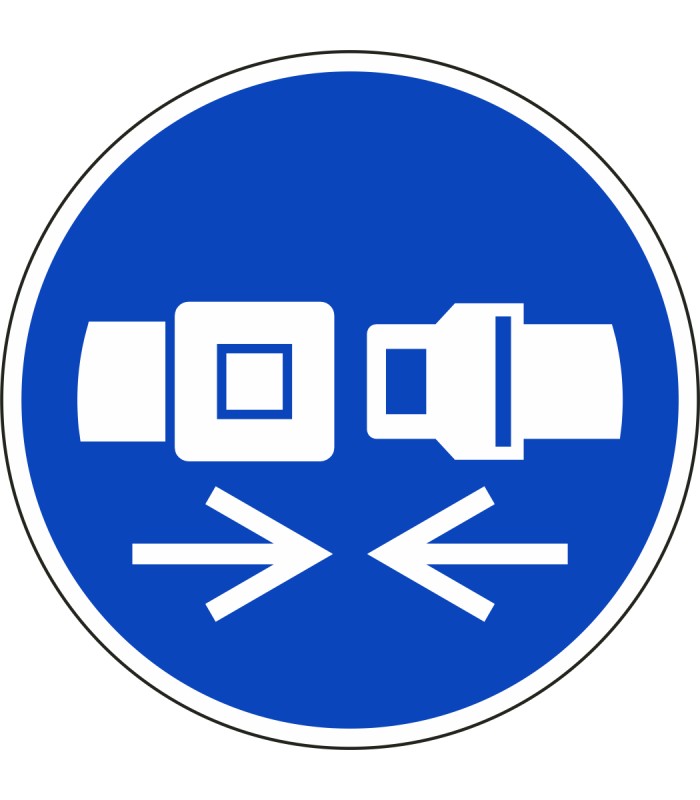 ISO-7010 'veiligheidsriem verplicht' stickers zijn verkrijgbaar in verschillende afmetingen en tevens in spiegelbeeld.