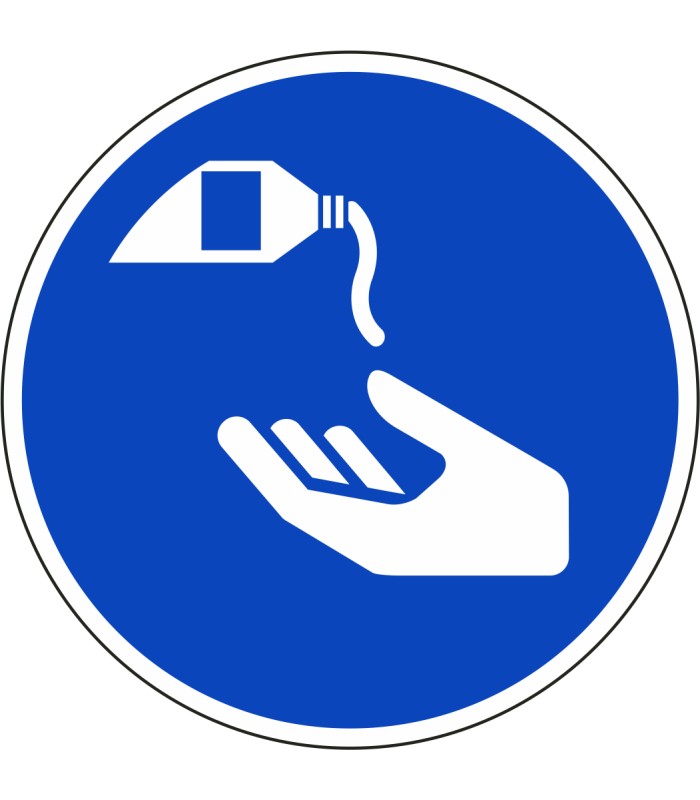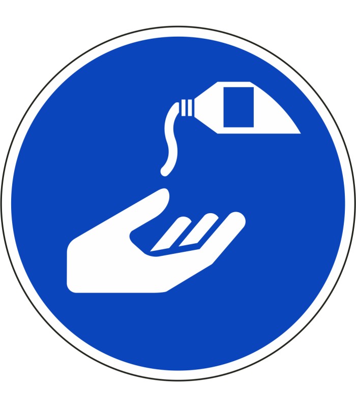 ISO-7010 'beschermende crème verplicht' stickers zijn verkrijgbaar in verschillende afmetingen en tevens in spiegelbeeld.