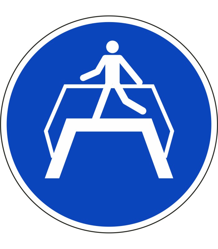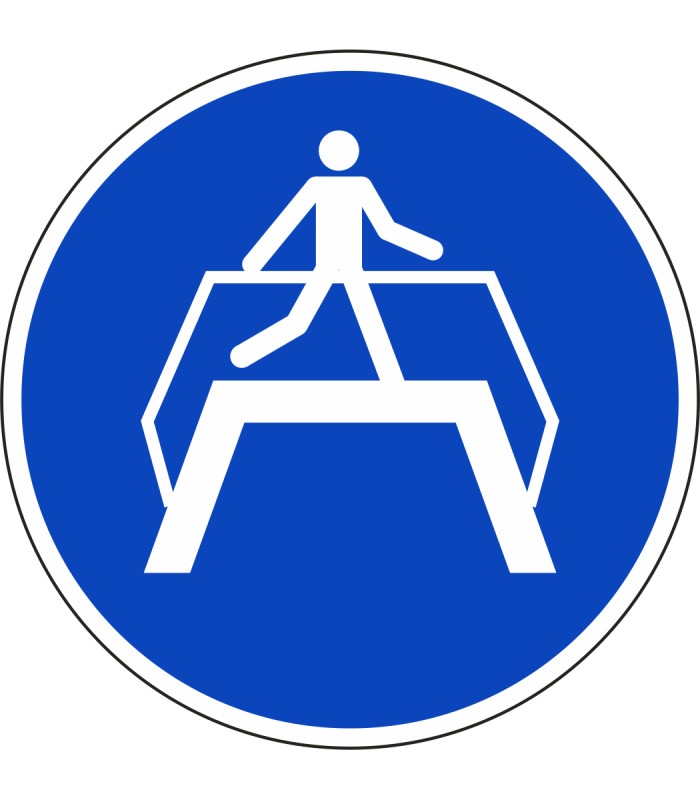 ISO-7010 'oversteekplaats gebruiken' stickers zijn verkrijgbaar in verschillende afmetingen en tevens in spiegelbeeld.